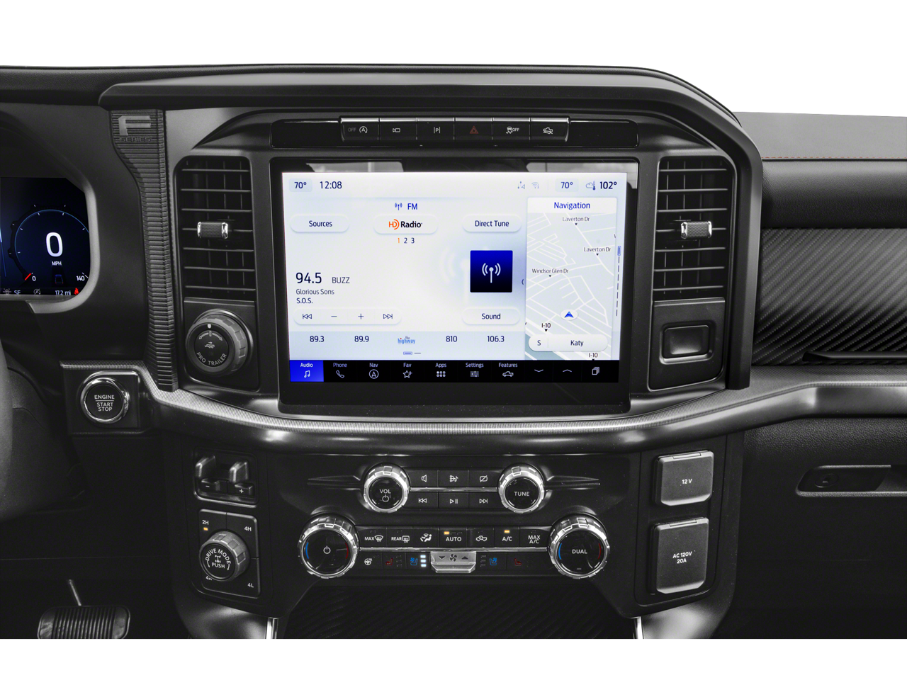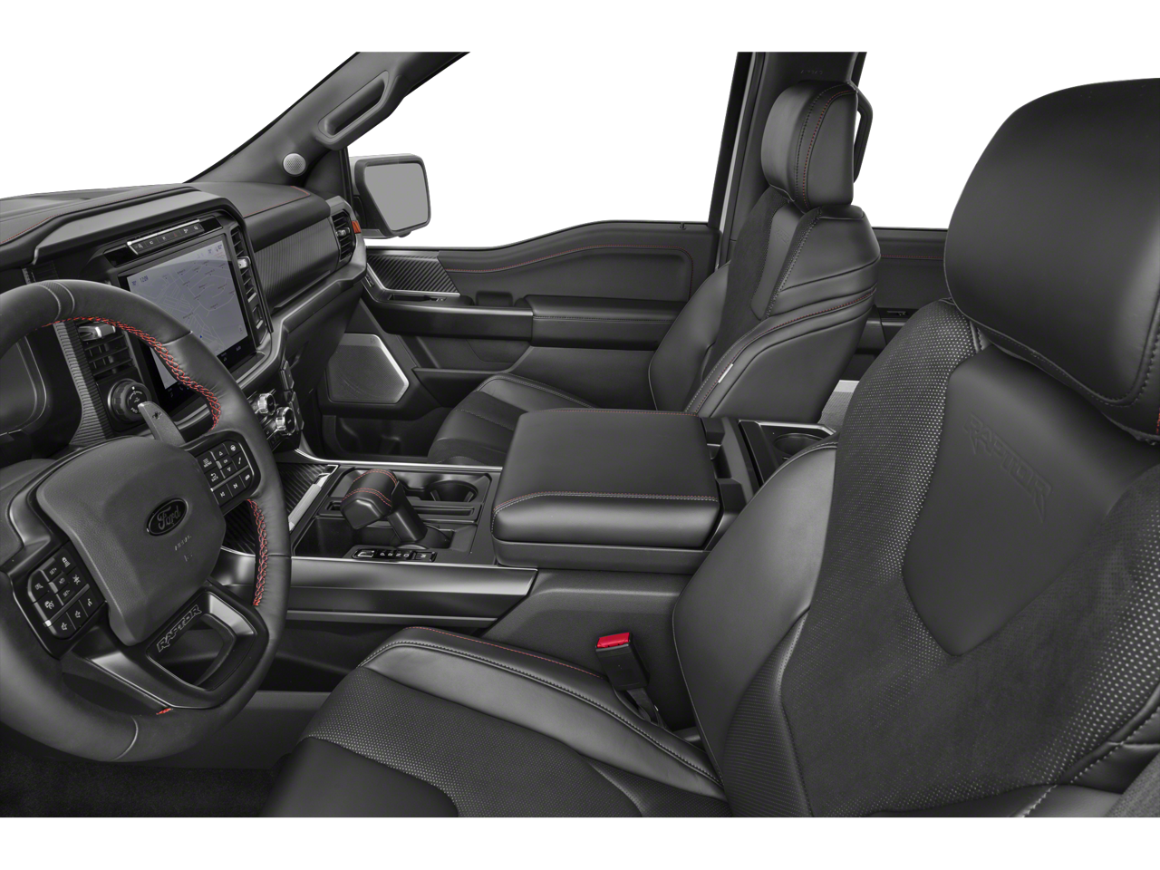 Inside, the Raptor offers a premium, feature-rich cabin that includes a stunning B&O Unleashed Sound System, a Heads-Up Display, and Alcantara Suede & Leather RECARO Front Seats. The SYNC 4 infotainment system with Enhanced Voice Recognition and Connected Navigation ensures you stay connected and in control.