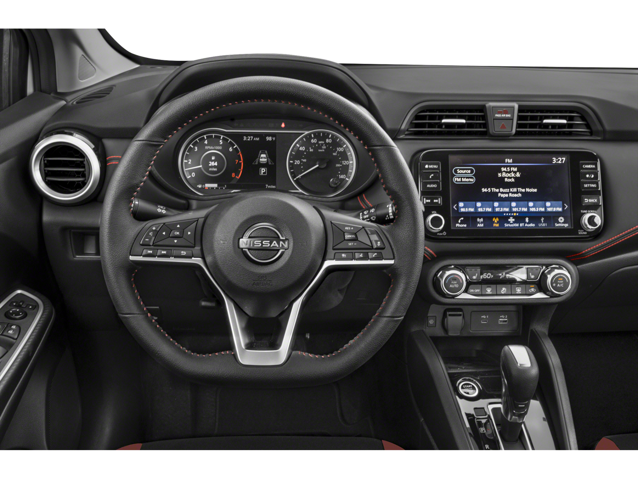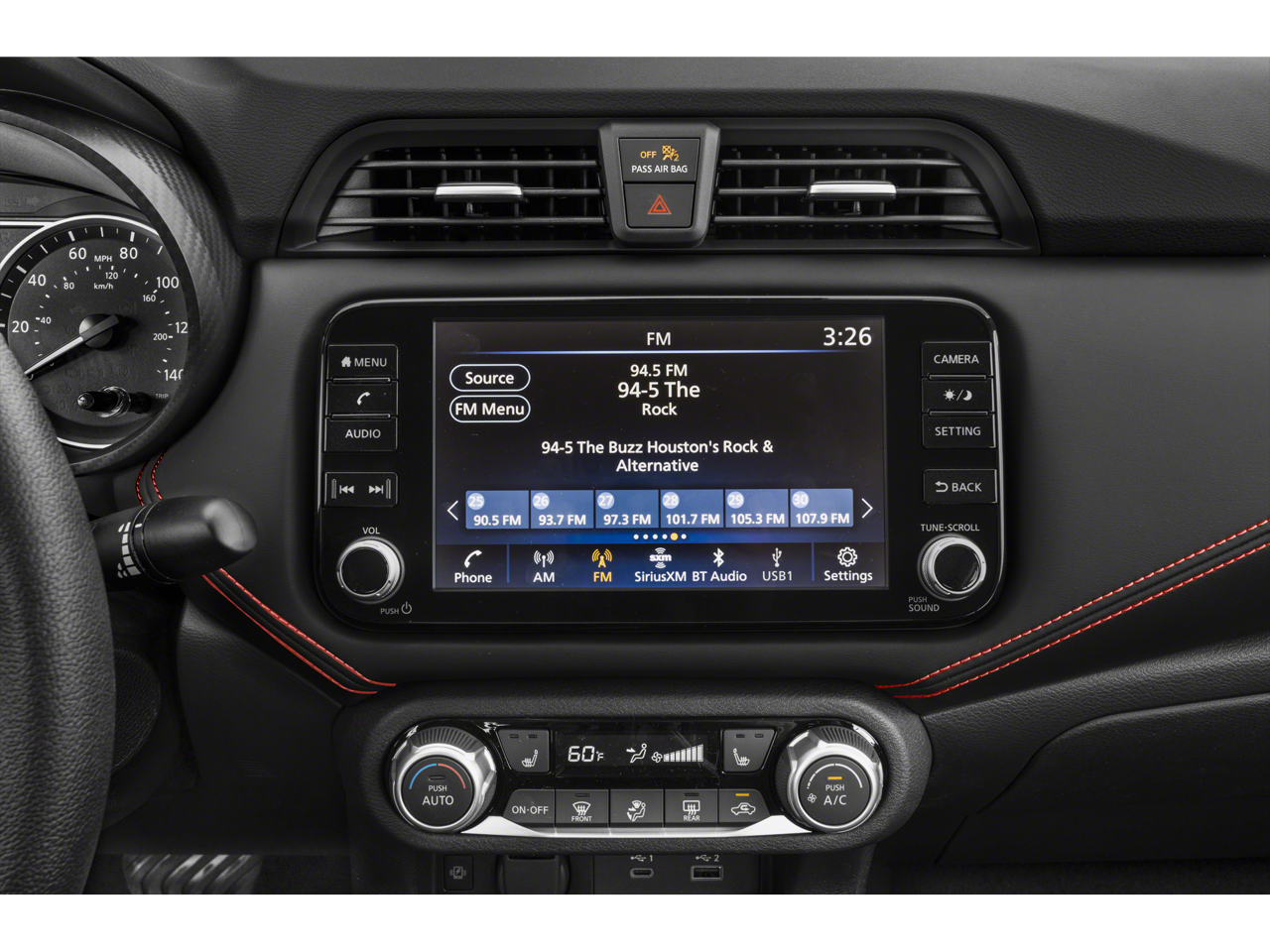 - Radio: AM/FM Audio System -inc: RDS, MP3, aux-in, 8" color touchscreen display, SiriusXM radio, NissanConnect services, Wi-Fi Hotspot, Bluetooth® hands-free phone system, streaming audio via Bluetooth®, interface for iPod and other compatible devices, hands-free text messaging assistant, Siri Eyes Free/Google Assistant voice recognition, 6 speakers, 3 USB ports (2-charge only) and 1 USB-C port on center cluster